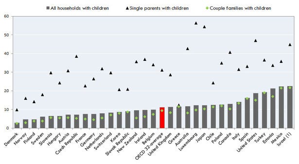 There is a wealth of empirical research indicating a strong correlation between poverty and growing up with a single parent—especially a single mother. As the below chart from Karen Kornbluh illustrates, this correlation is true across the industrialized world. For reasons both cultural and practical, we have not been comfortable confronting this problem.
