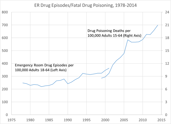 And drug emergencies and deaths have certainly risen. My chart shows two crude indicators. The first series is from 1978 to 2001 and comes from emergency room reports collected by various federal agencies. The second runs from 1999 to 2014 and is based on mortality data from the National Vital Statistics System.