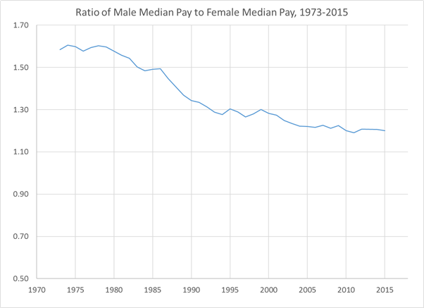 In 2015, the hourly pay of the median male worker — the one in the middle of all male workers — was 13 percent higher than in 1973 and 14 percent higher than in 1996. Now, a glass-half-empty person could say that essentially all of that increase came in the five years between 1997 and 2002. She could also say that pay in 2015 was no higher than in 2007 or 2000. But it is not lower than before. Indeed, the 2016 data to date indicates that median hourly pay among men at the end of 2016 is higher than it has ever been. Ever.