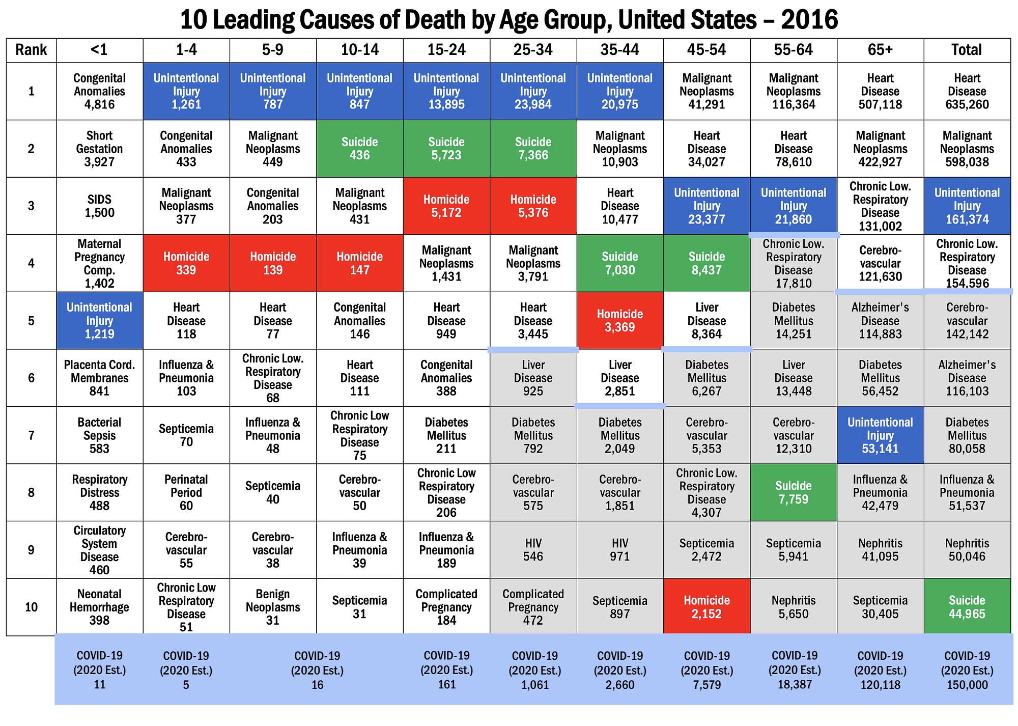According to our projections, if 150,000 Americans in total die of COVID-19, approximately 2,700 35–44-year olds would be in that category. For context, in 2016, 2,851 individuals in that age range died of liver disease; 3,369 died of homicide; 7,030 died in suicides; 10,477 died of heart disease; 10,903 died of malignant cancers; and 20,975 died of unintentional injuries such as car accidents.