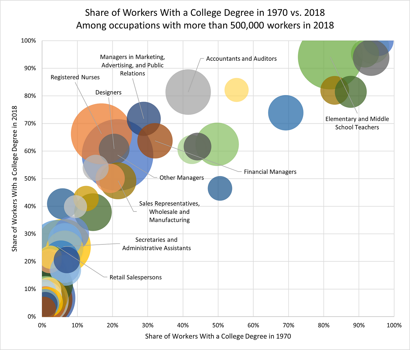 There’s some truth to this perception. A college degree has become a de facto requirement for many middle-income jobs, even those in which a degree was previously not the norm. For instance, just 42% of accountants and auditors in 1970 had a college degree, but today the figure is 81%. It’s becoming more common for secretaries and retail sales workers to have bachelor’s degrees, and college has become almost universal among schoolteachers and pharmacists.