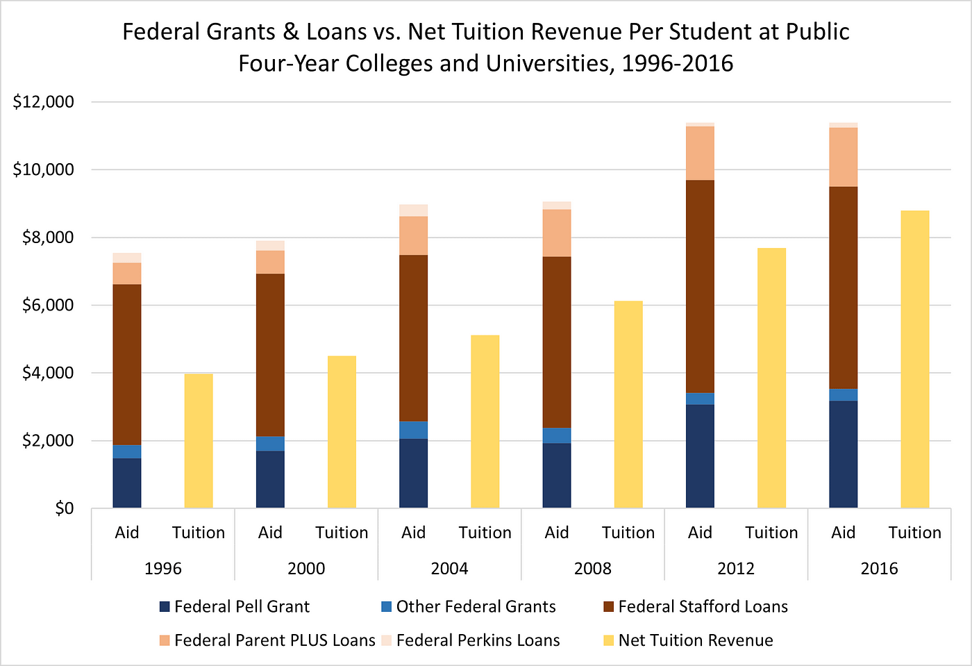 Americans are rightfully worried about how to pay for college tuition, which has risen in price far faster than most other consumer goods. In response to rising tuition, federal and state governments have more than doubled the real value of financial aid they provide to public college students. However, the inexorable rise in underlying college costs means that “net” tuition after aid has still gone up. If tuition revenue per student had not increased in real terms since 1996, expansions in financial aid would have reduced the average in-state public college student’s tuition bill to zero.