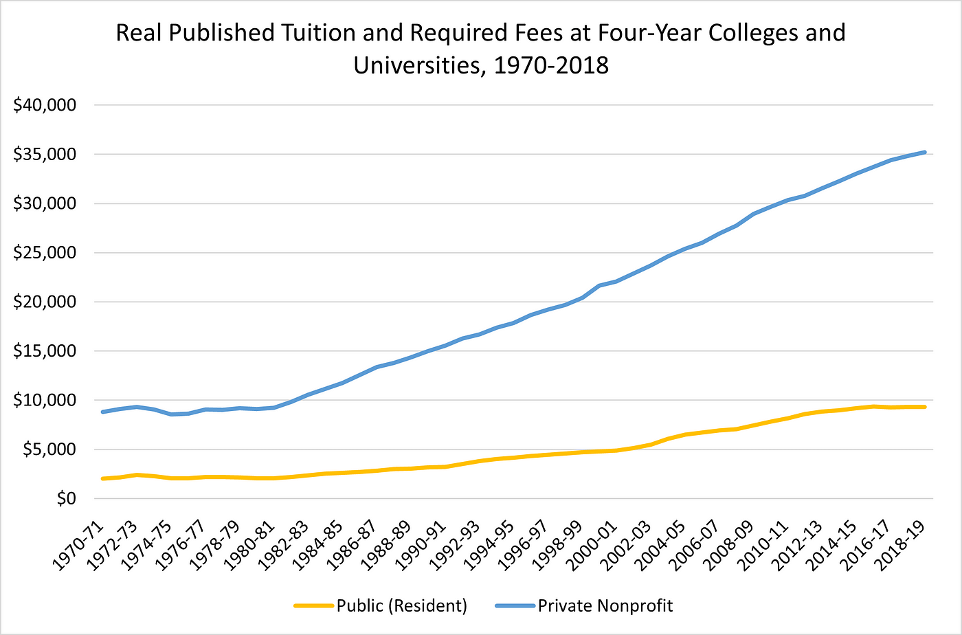 While Yale and its Ivy League peers are outliers, the increase in sticker-price tuition at the average university is still astronomical. At both public and private nonprofit four-year schools, published tuition rates have quintupled in real terms since 1970. The average freshman at a four-year private university now faces a price tag of more than $35,000.
