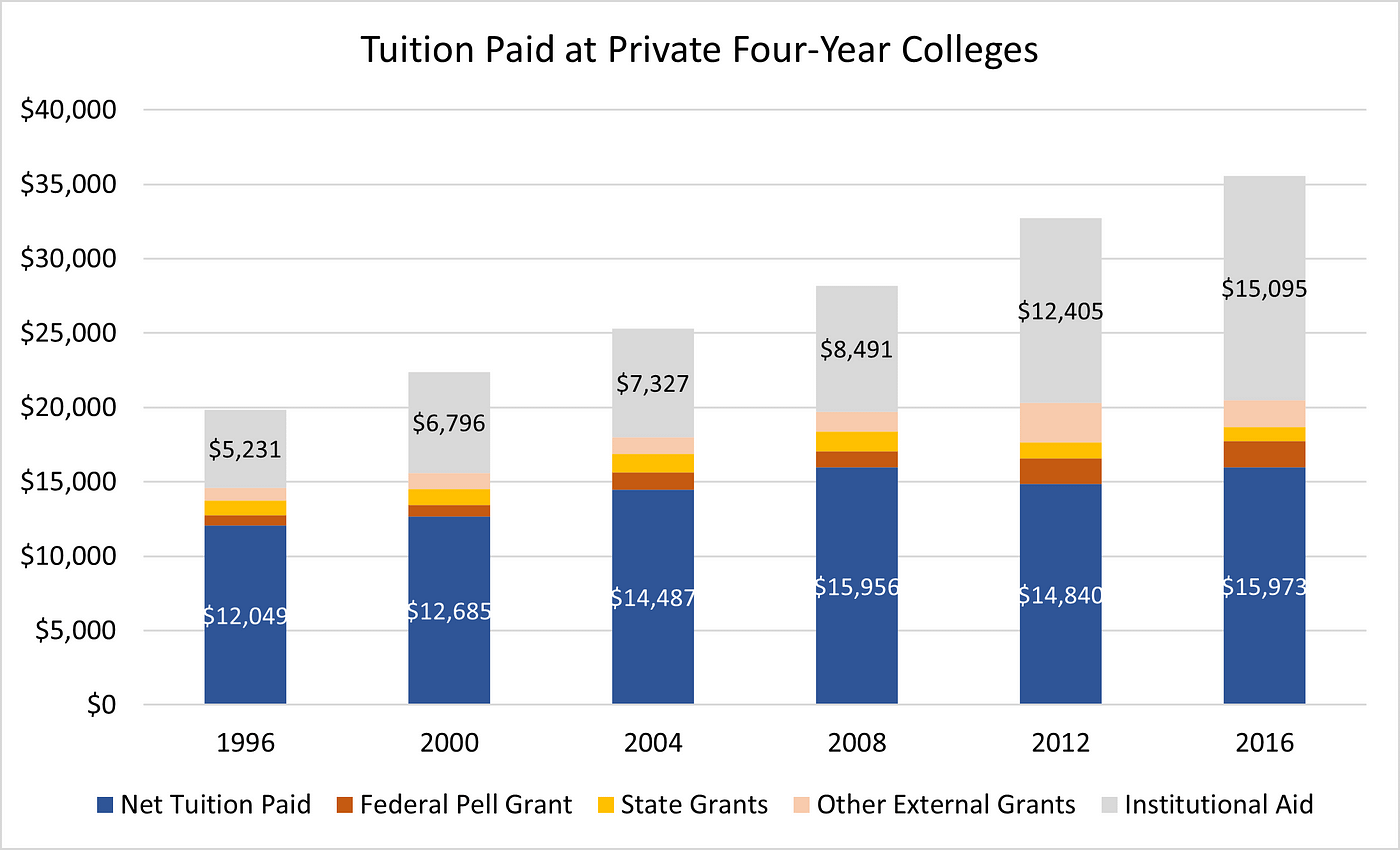 Net price, or the amount a student pays after all sources of financial aid are applied, has risen far less than sticker price. Financial aid comes from multiple sources. The institution itself commonly provides a student with internal grants (institutional aid) that reduce sticker price. Institutional aid is more or less an accounting fiction, as it is essentially revenue that the college or university pays to itself. A $2,000 rise in sticker-price tuition accompanied by a $2,000 per-student rise in institutional aid does not change the net tuition revenue that the institution receives.